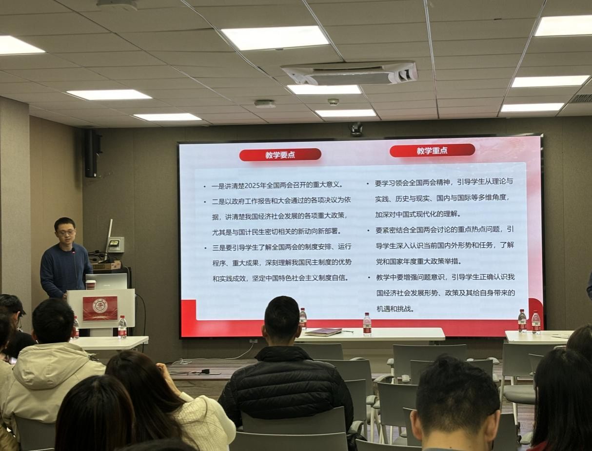 形势与政策课专题展示环节,best365英国体育在线青年教师侯冠华以“从两会蓝图到青年担当:2025中国高质量发展的机遇与责任”为主题,为任课教师作了精彩的教学展示,展望了2025年两会政策议题,探讨了青年在新时代背景下的责任与担当。